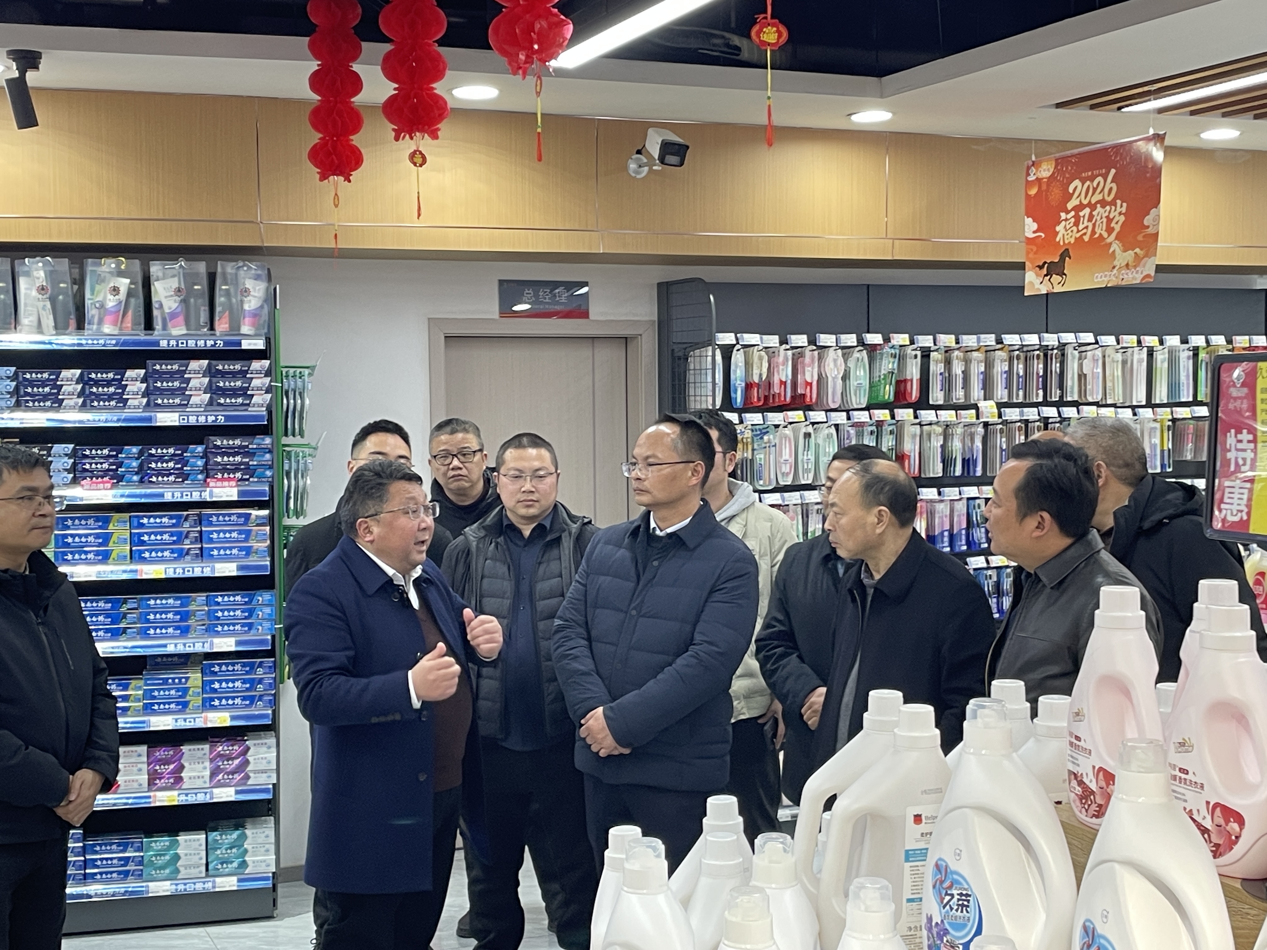 在老鄰居·平昌供銷生活超市,考察組聽取了社有企業(yè)負責人對供銷超市經(jīng)營模式、商品結構、銷售情況的介紹,并就社有企業(yè)融入城鄉(xiāng)便民服務、拓展消費市場的運營模式進行了探討。